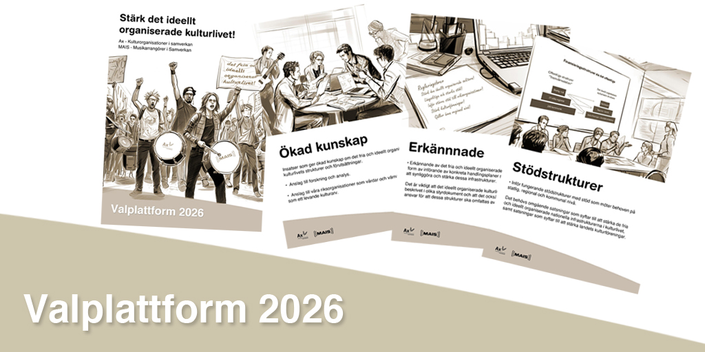 MAIS och Ax lyfter tillsammans tre prioriterade områden där politiken kan göra verklig skillnad för att vi och våra medlemmar ska kunna fortsätta att bidra till uppfyllandet av de nationella kulturpolitiska målen, framför allt delaktighetsmålet. Vi föreslår åtgärder som kommer stärka en viktig och vital del av kultursektorn, säkra arbetstillfällen för tusentals kulturarbetare och möjliggöra för tiotusentals nya att få ta del av kultur. Dessa åtgärder bidrar också i hög grad till att stärka demokratin, den konstnärliga friheten och yttrandefriheten, den ideologiska grund på vilket Sverige som samhälle vilar!